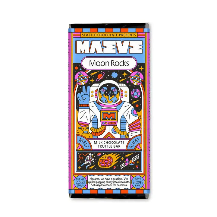 Houston, we have a problem. We spilled popping candy into chocolate. Actually, Houston? It's delicious. Perfect for all astronauts and space fans! Flavor: Creamy milk chocolate with all natural popping candy.