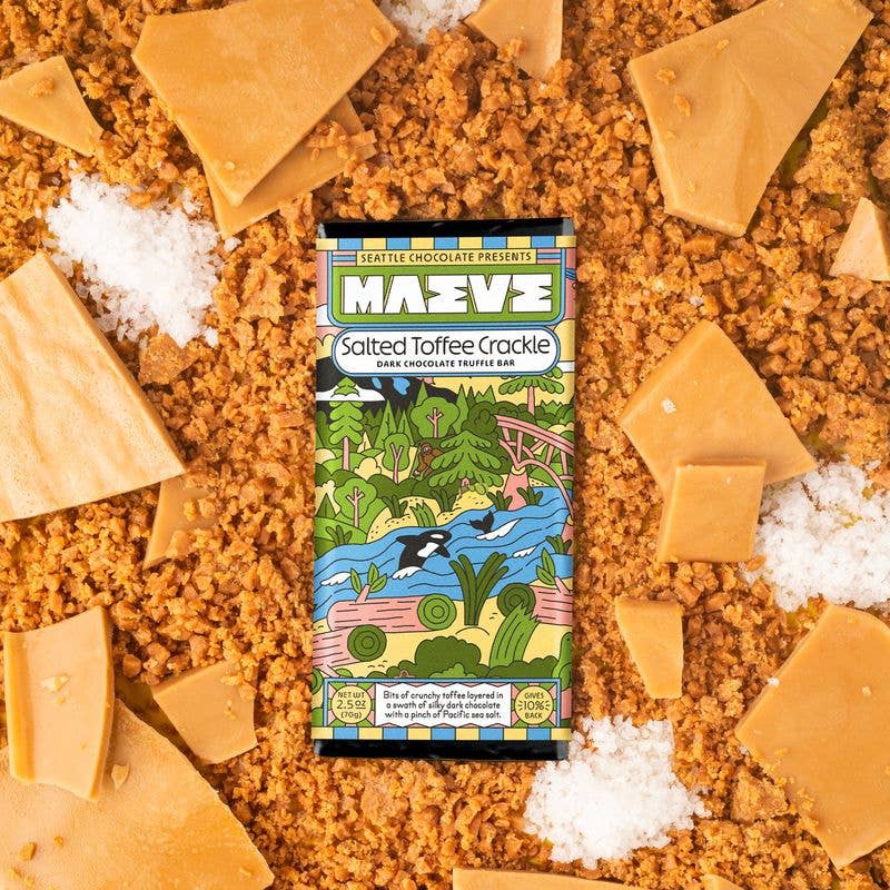 Bits of crunchy toffee layered in a swath of silky dark chocolate with a pinch of Pacific sea salt. Flavor: Dark chocolate shell with toffee bits and Pacific sea salt. Explore more from our Seattle (tourist) Collection: Café Latte Crunch, Peanut Butter Roast bars, and Sound of Seattle Bonbon Gift Box When you pick Maeve, you’re choosing a sustainably sourced, eco-conscious, woman-owned brand — and you’re also choosing FUN. • Woman-owned and led • 10% net profits donated to cocoa farmers • Ethically sourced, non-GMO chocolate • Carbon neutral