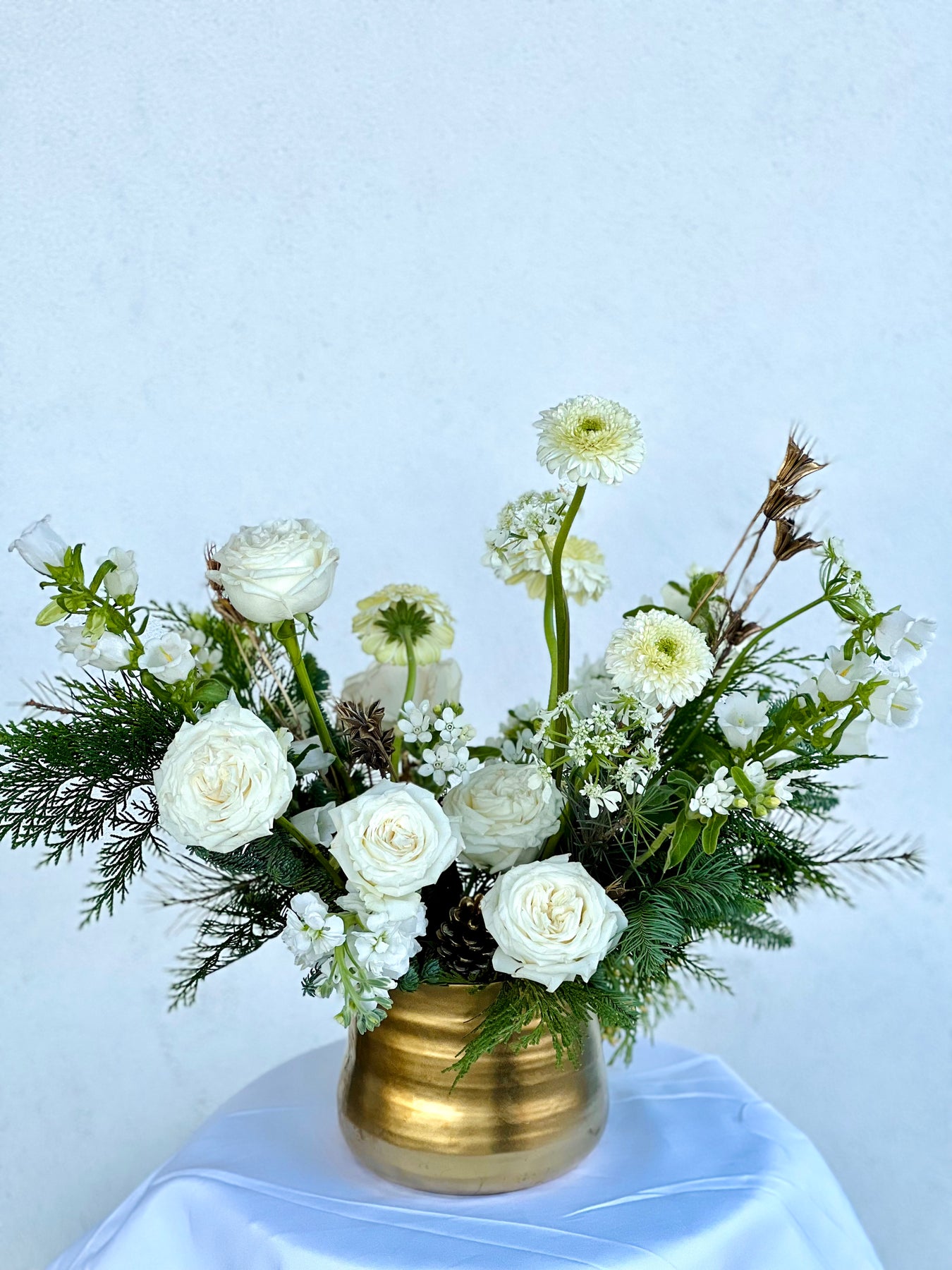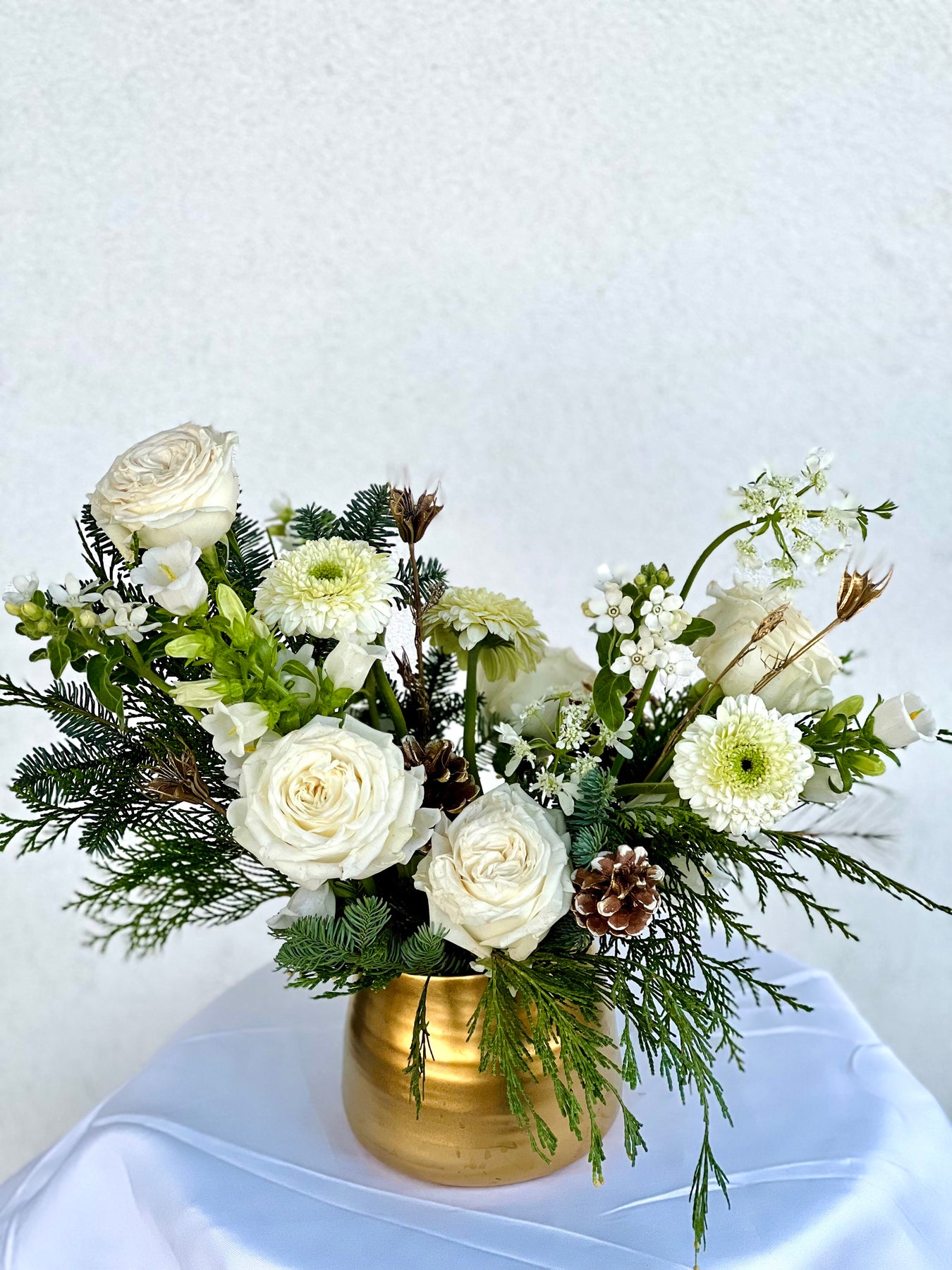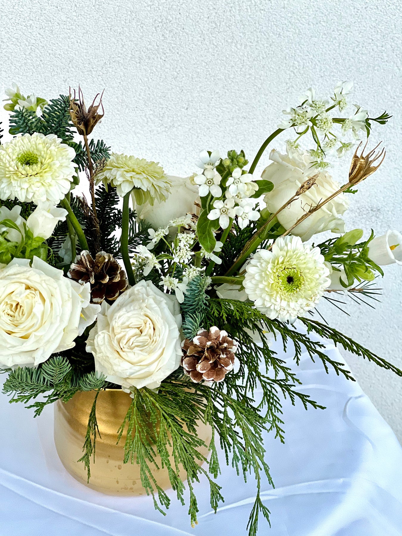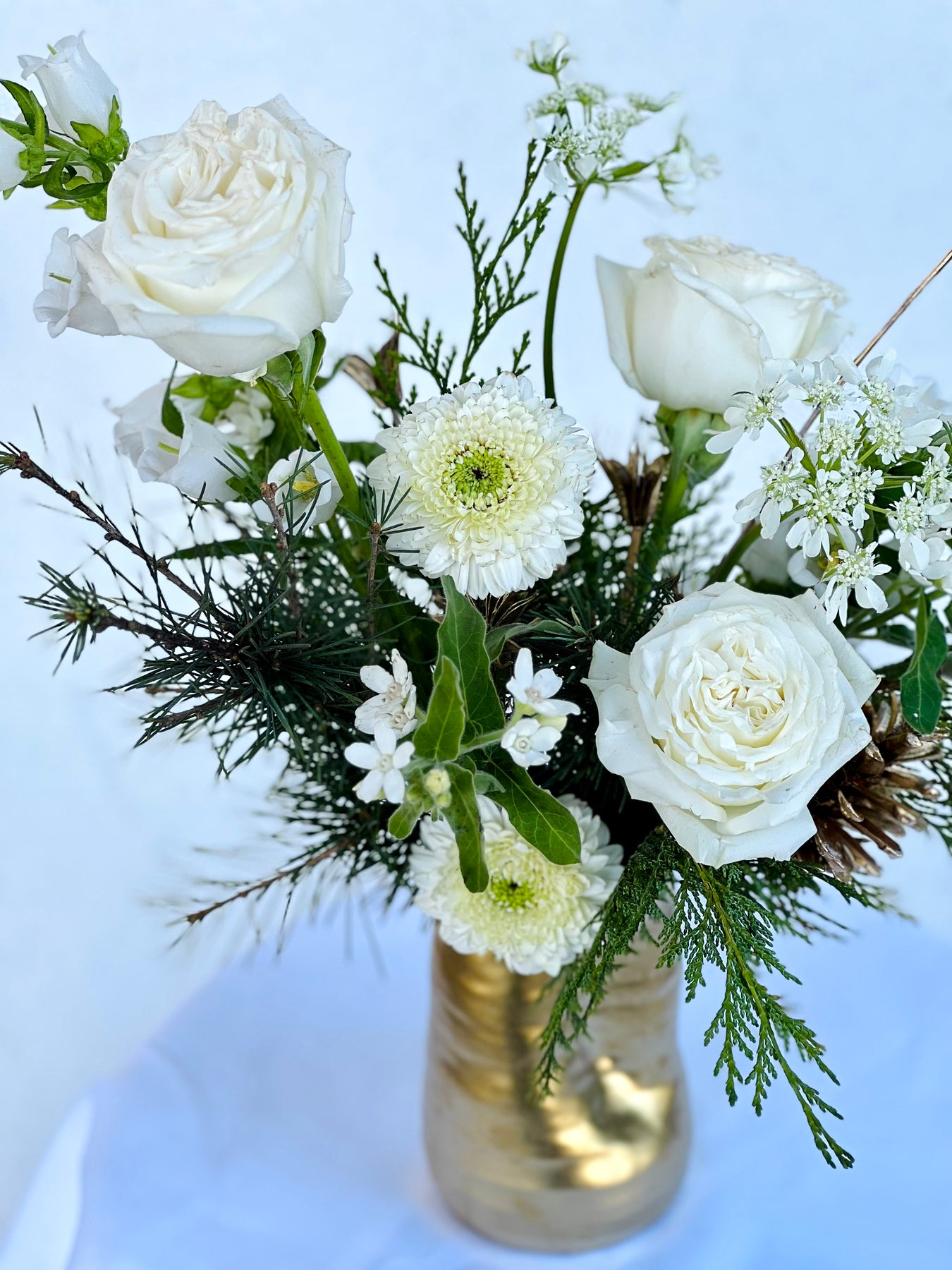 Available as as a bouquet or in a vase, White Christmas is a festive arrangement in a neutral wintry color palette- the perfect way to send your love and good wishes this holiday season! Available in three sizes. Image shows medium vase arrangement.