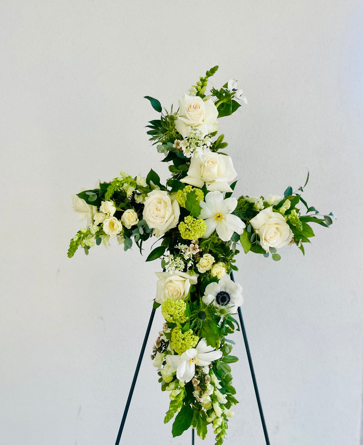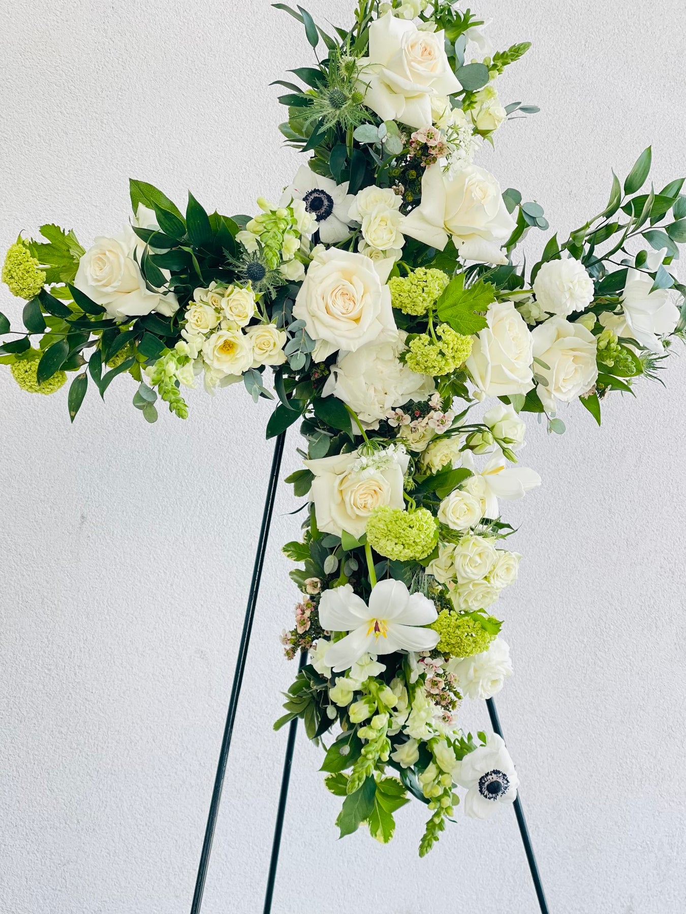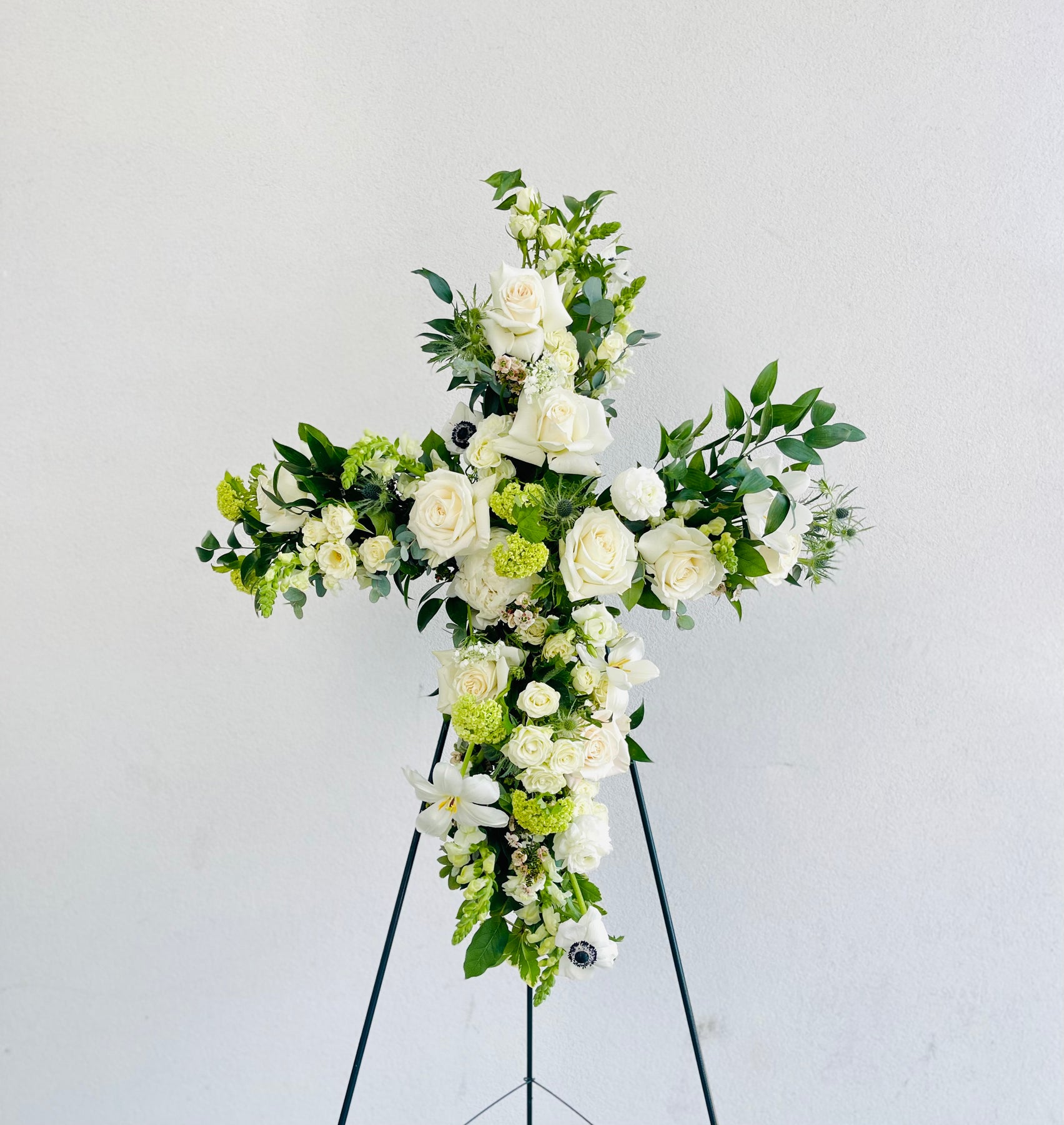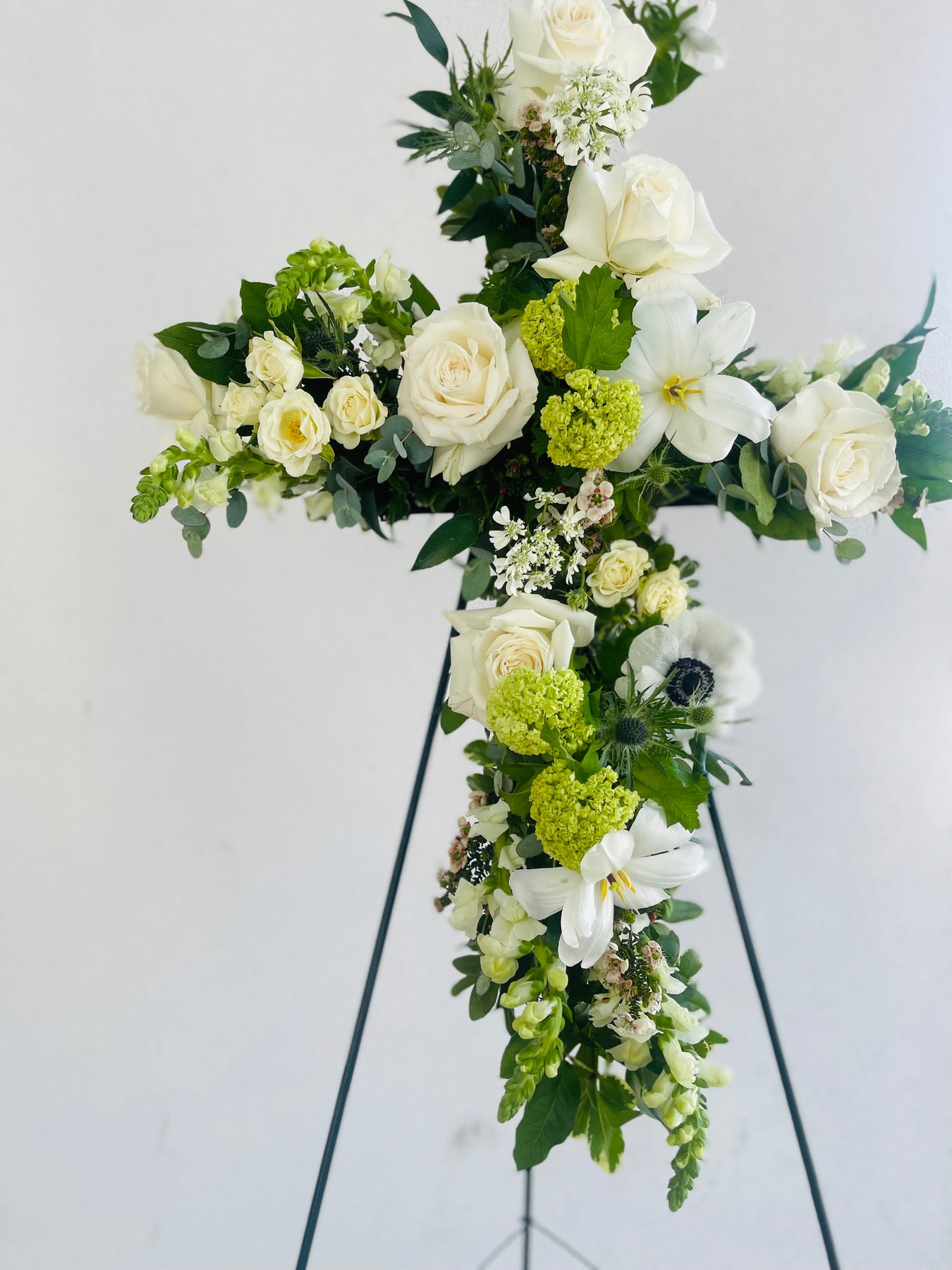 This classic Sympathy Cross arrangement is available in four different color palettes and designed in our signature garden style. Full of gorgeous flowers and lush greenery.