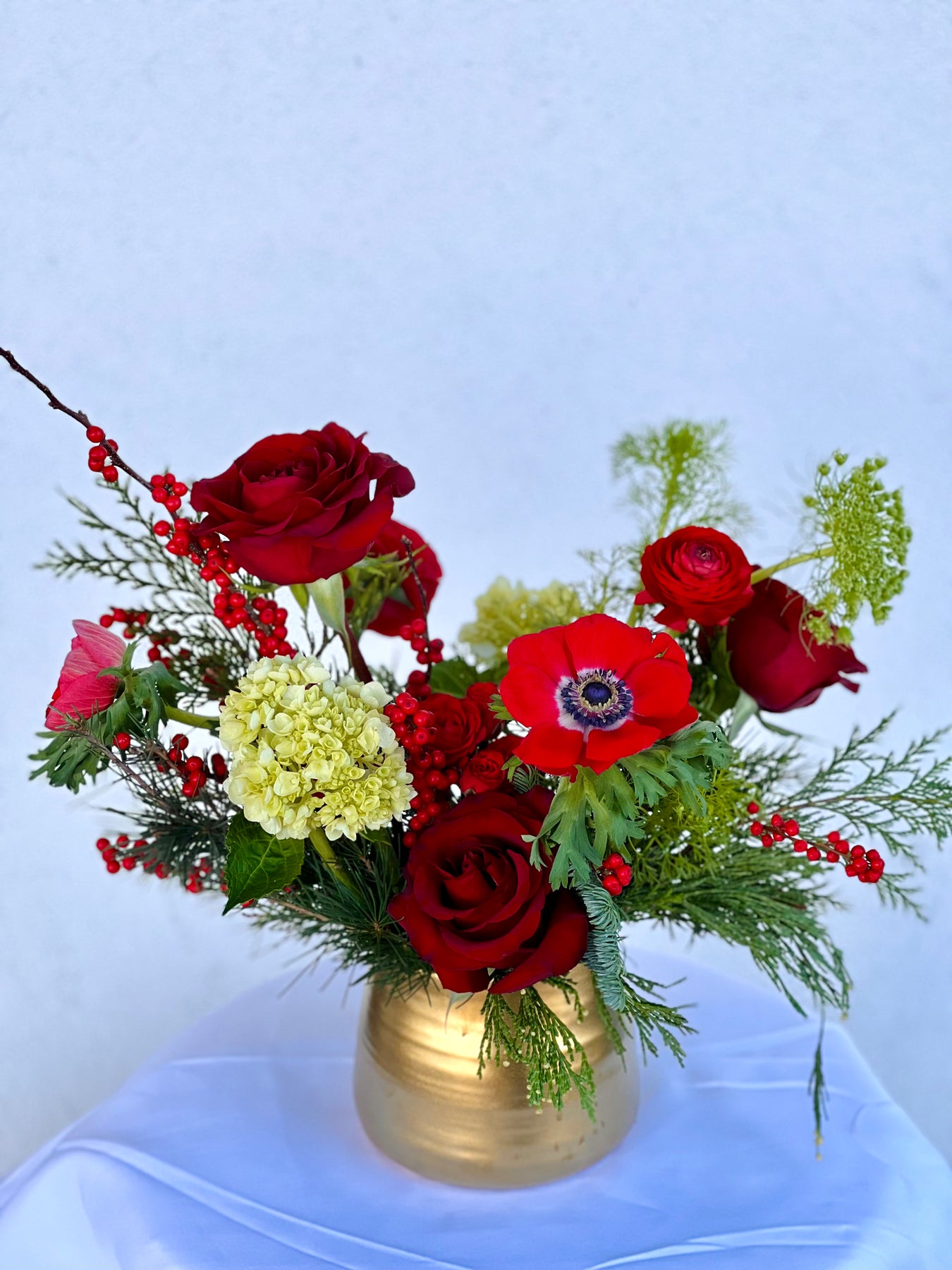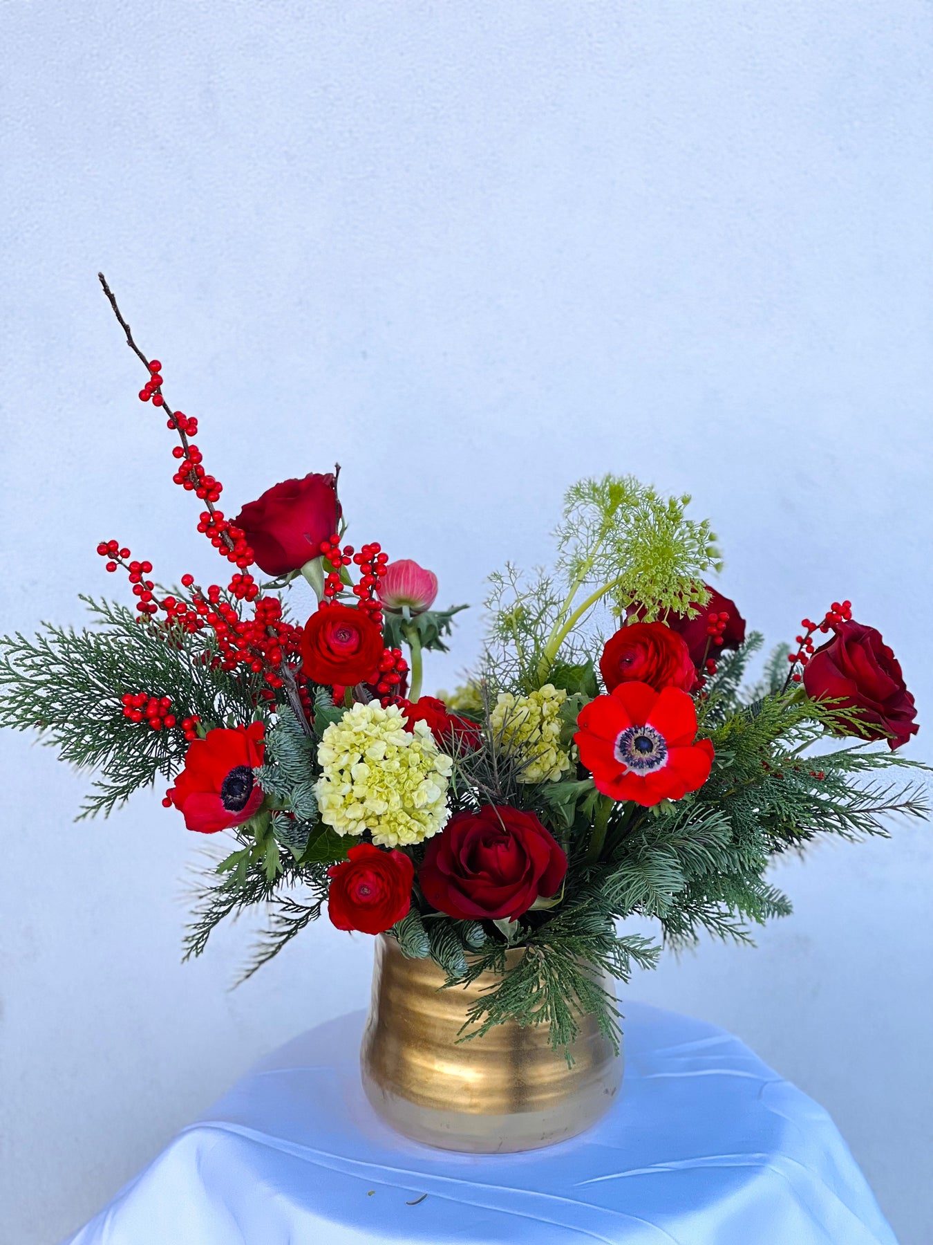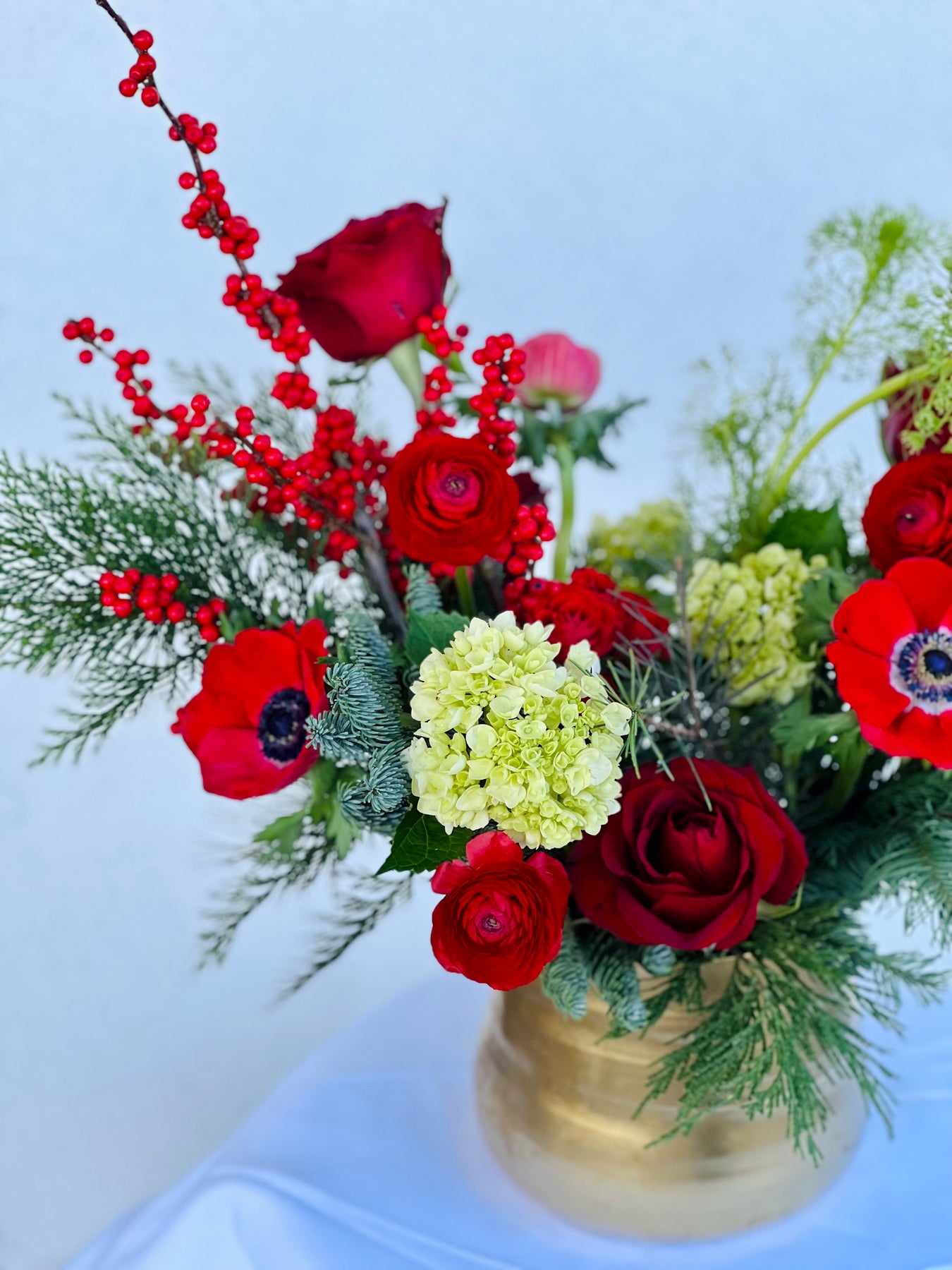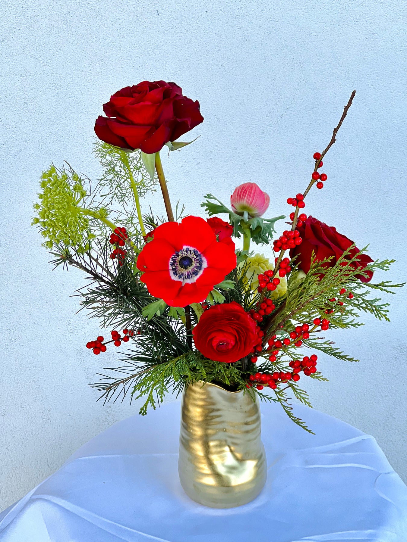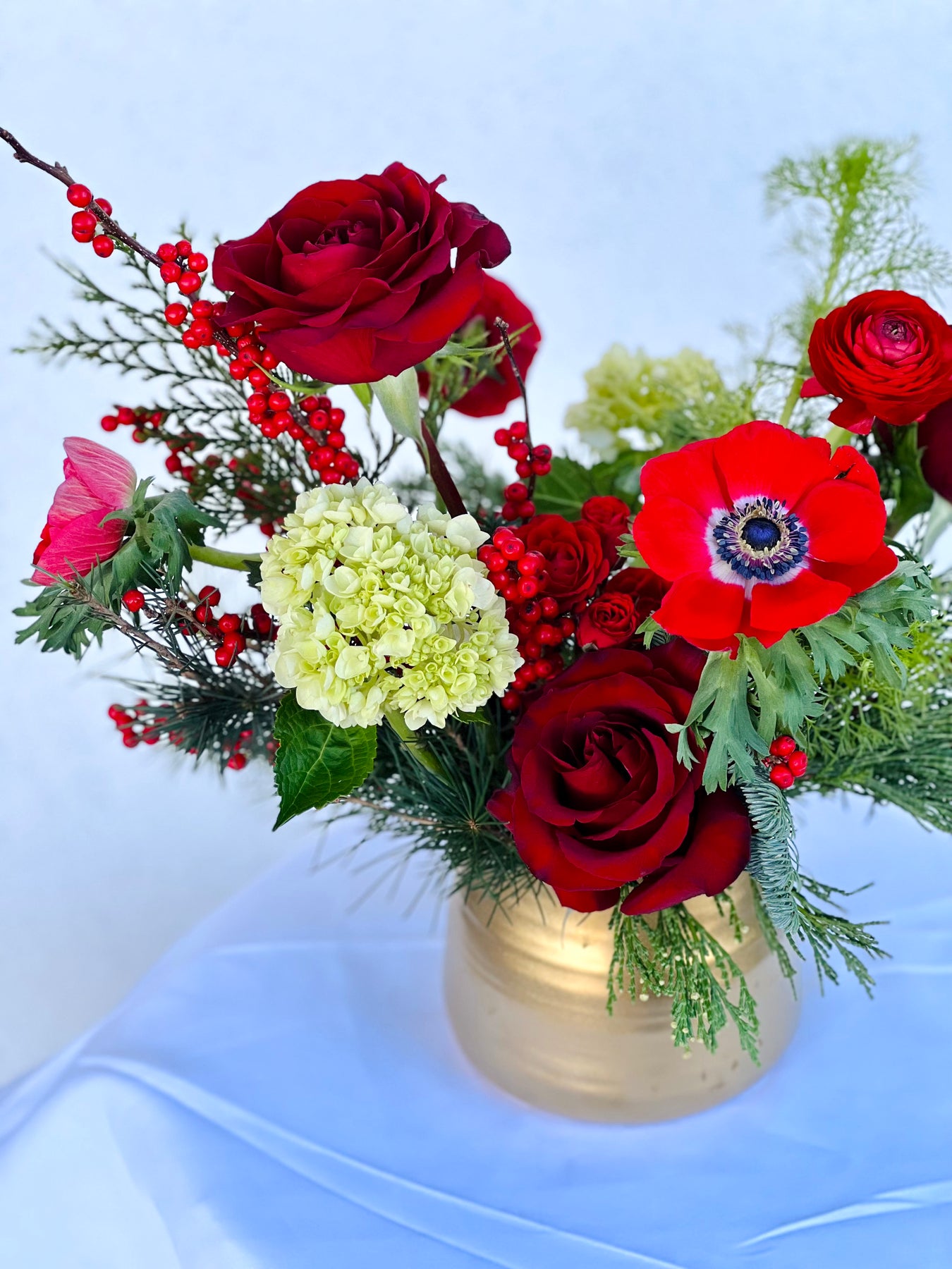 Available as as a bouquet or in a vase, Merry & Bright is a festive arrangement in a Christmas color palette- the perfect way to send your love and good wishes this holiday season! Available in three sizes. Image shows medium vase arrangement.
