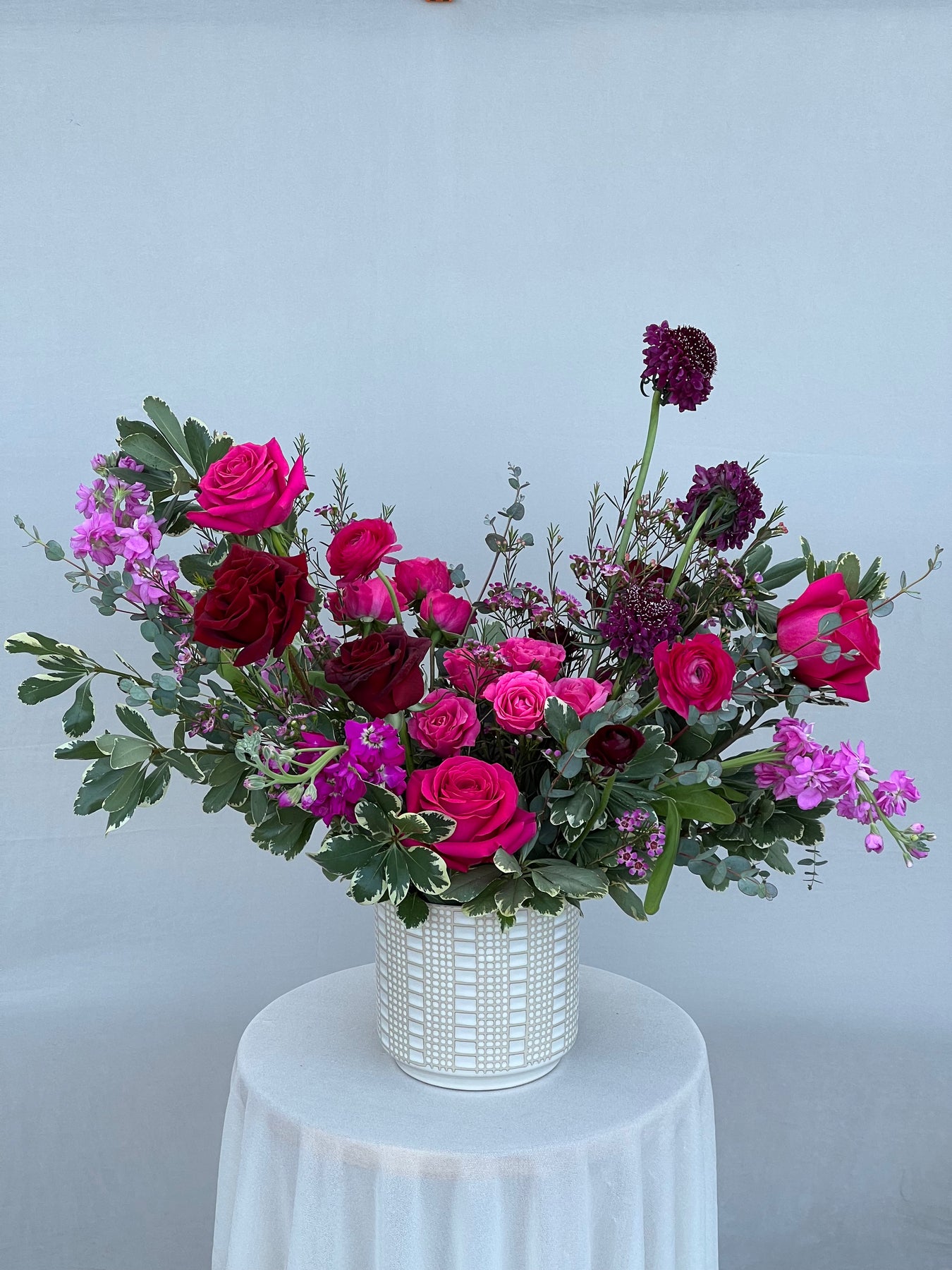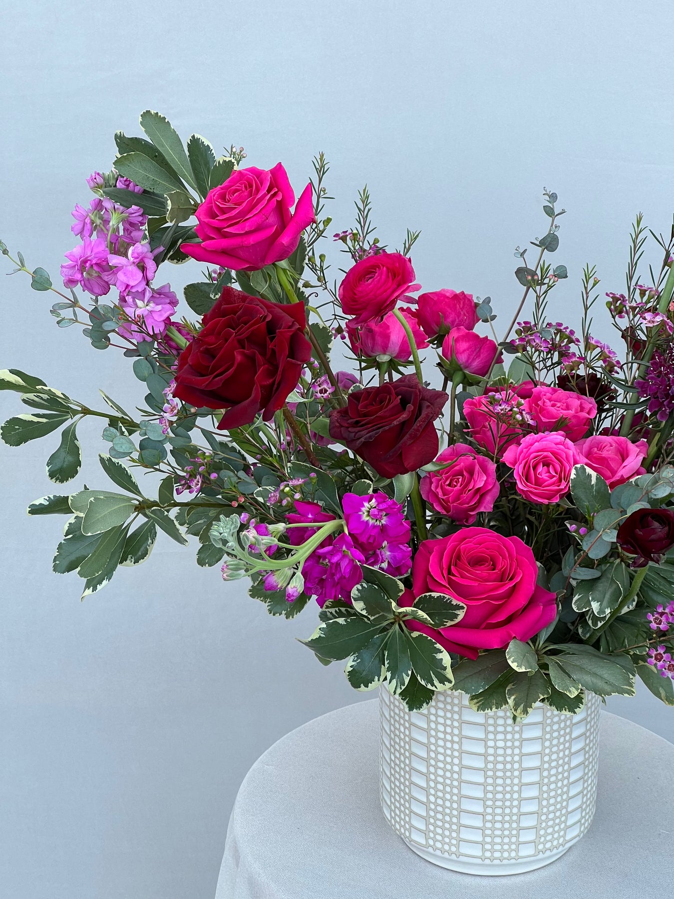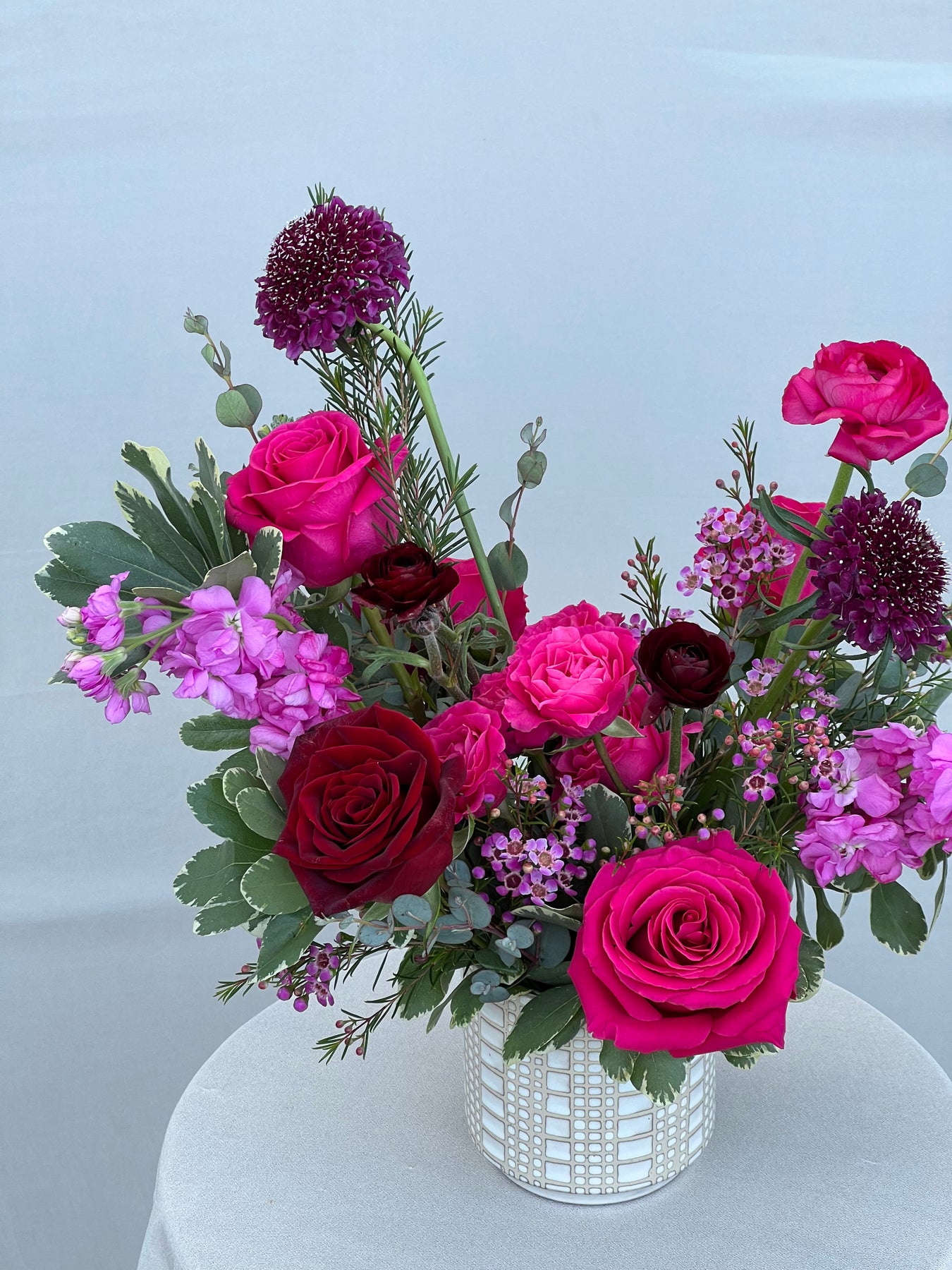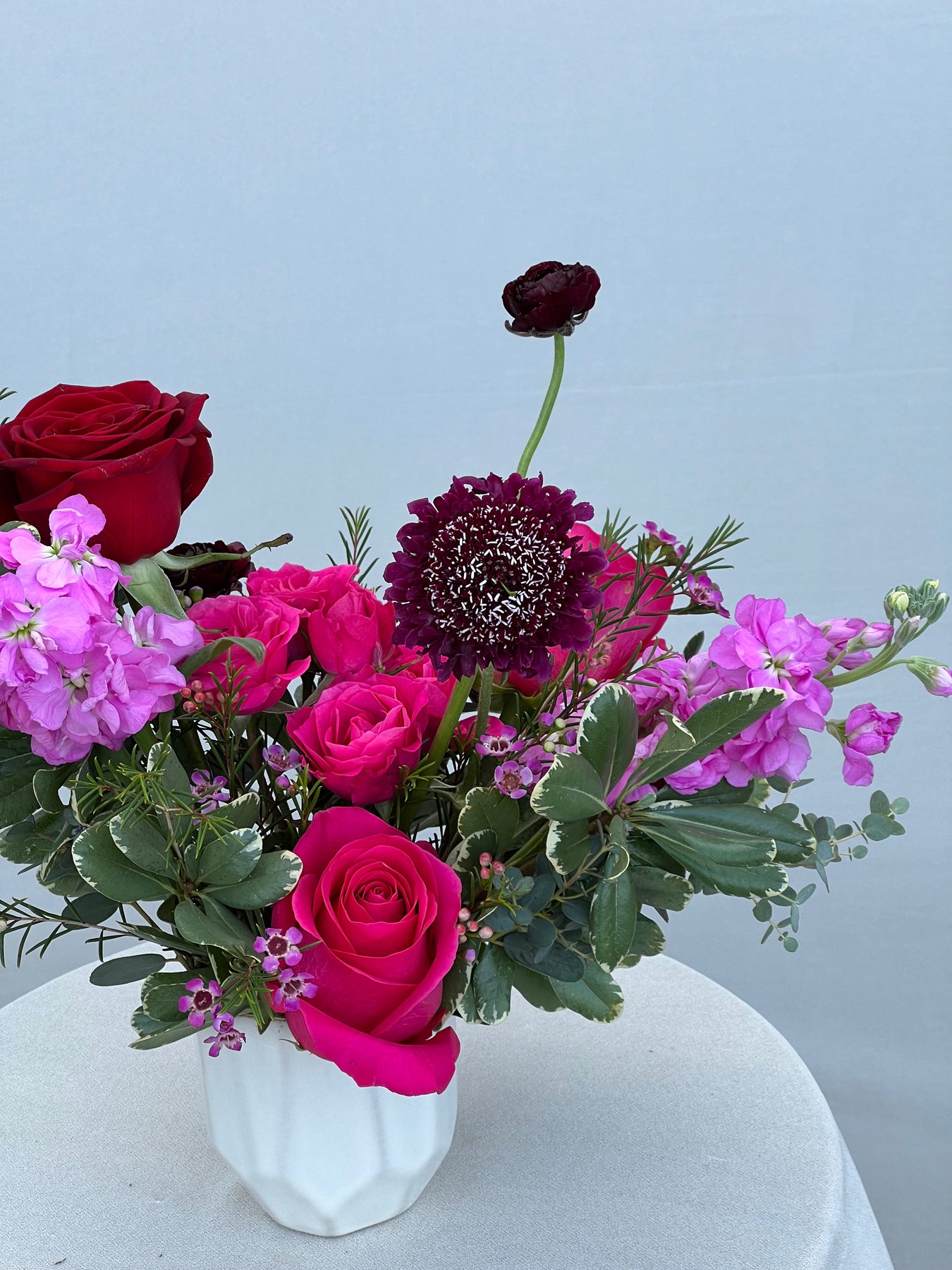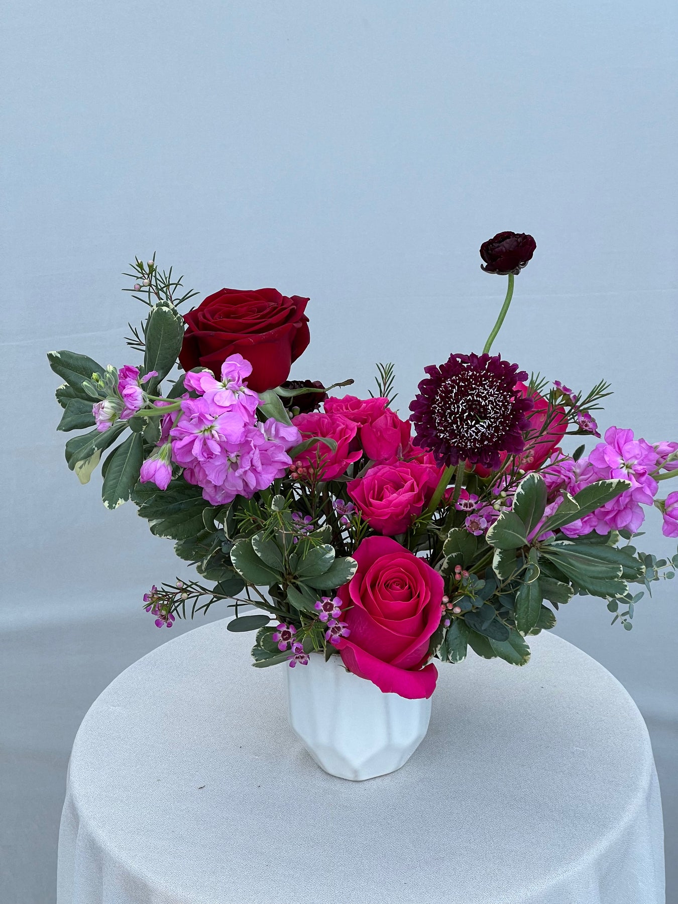 A curated mix of reds, pinks, and purples, these vase arrangements are full of all the best colors berries have to offer! Available as a vase arrangement or hand wrapped bouquet.