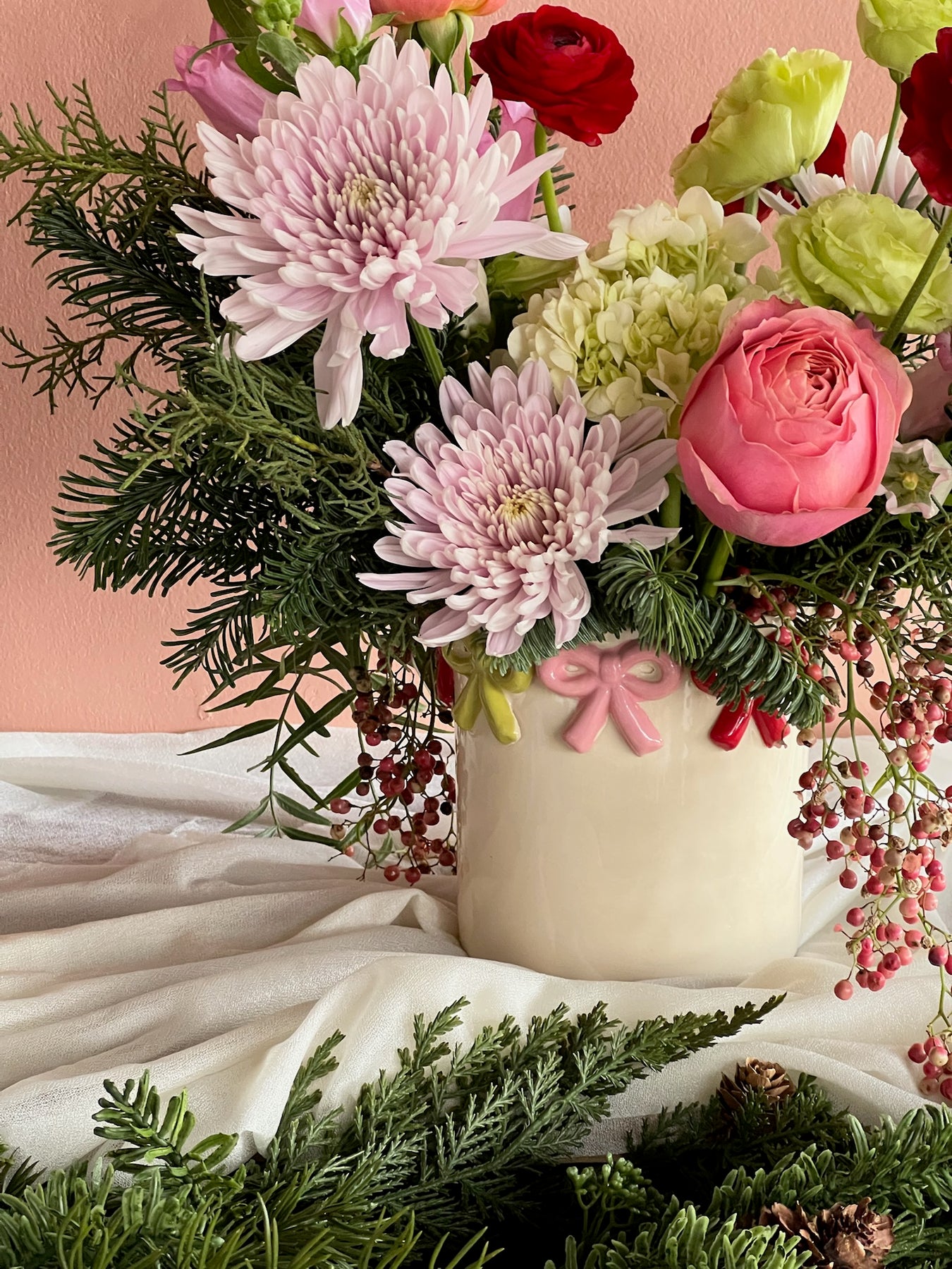 Sleigh All Day brings festive cheer to any space with this vibrant Christmas arrangement nestled in a charming bow vase. Bursting with colorful blooms in holiday hues, this playful centerpiece captures the joy and merriment of the season. Perfect for spreading Christmas spirit throughout your home or gifting to someone special, it's a delightful way to celebrate in style.