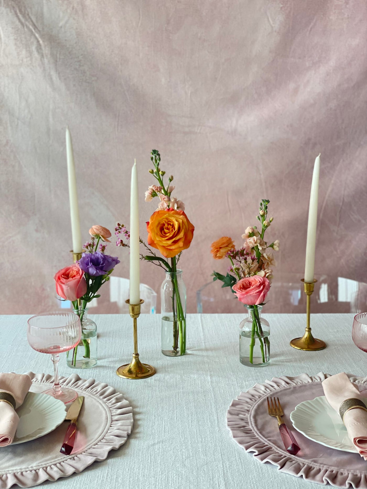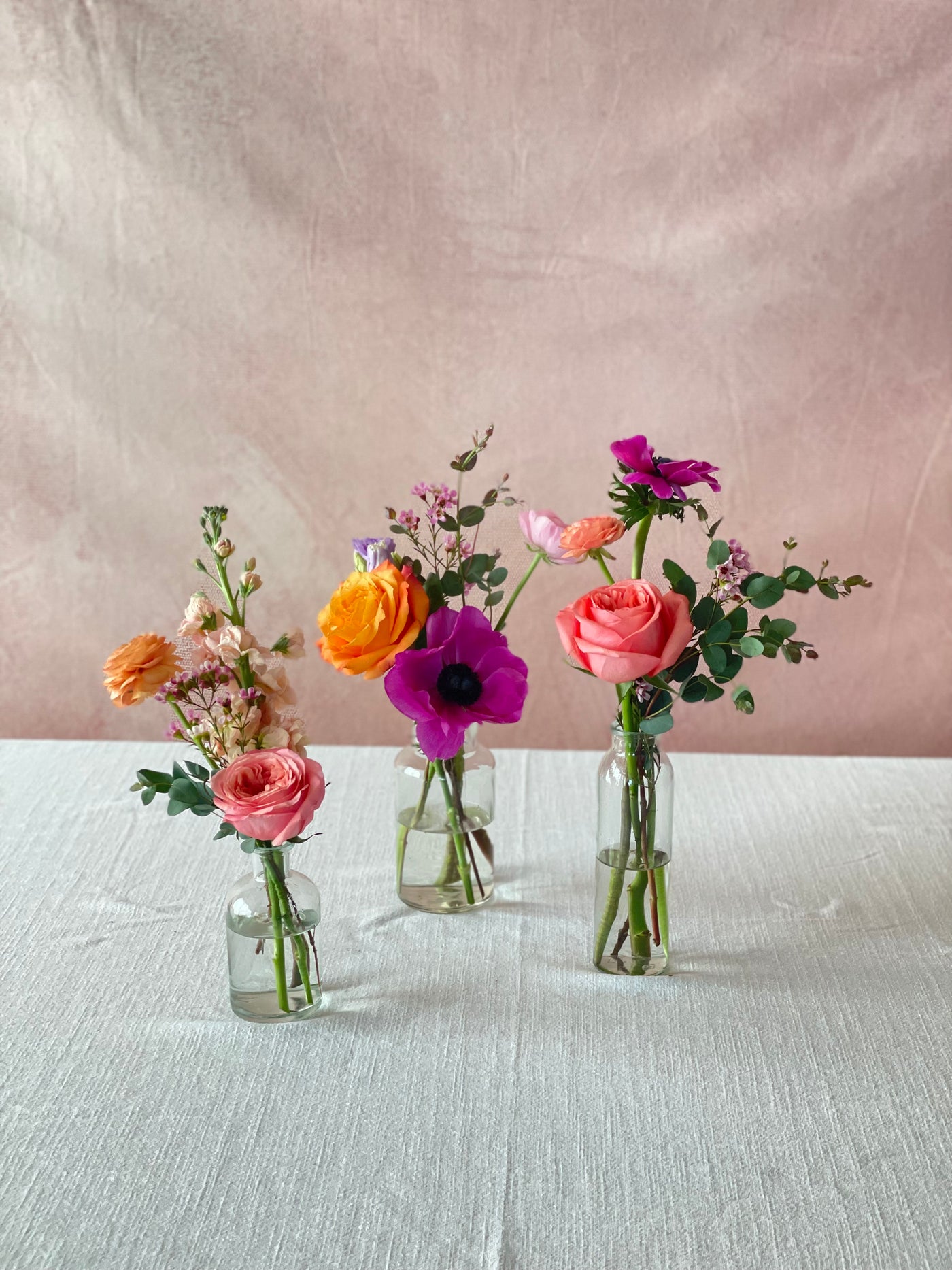 Our Budvase Trio is the perfect accent to use throughout your event. We love using these on the bar, coffee table, and on cocktail tables, etc. Choose from one of our curated color palettes or select custom for an even more personalized touch.