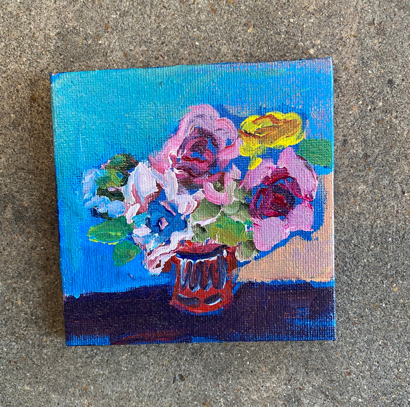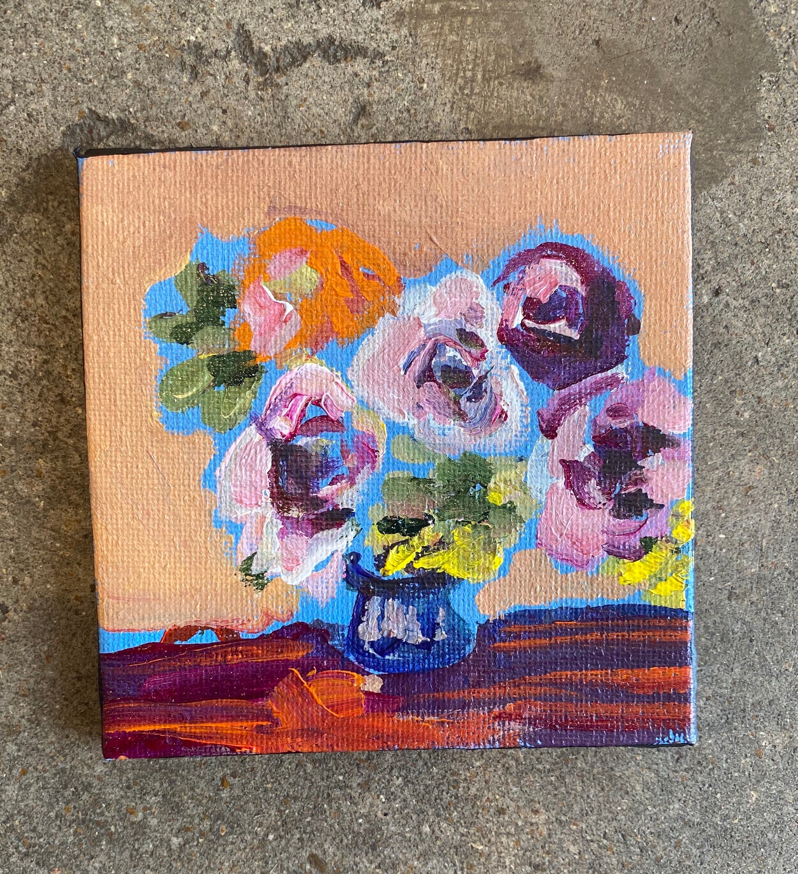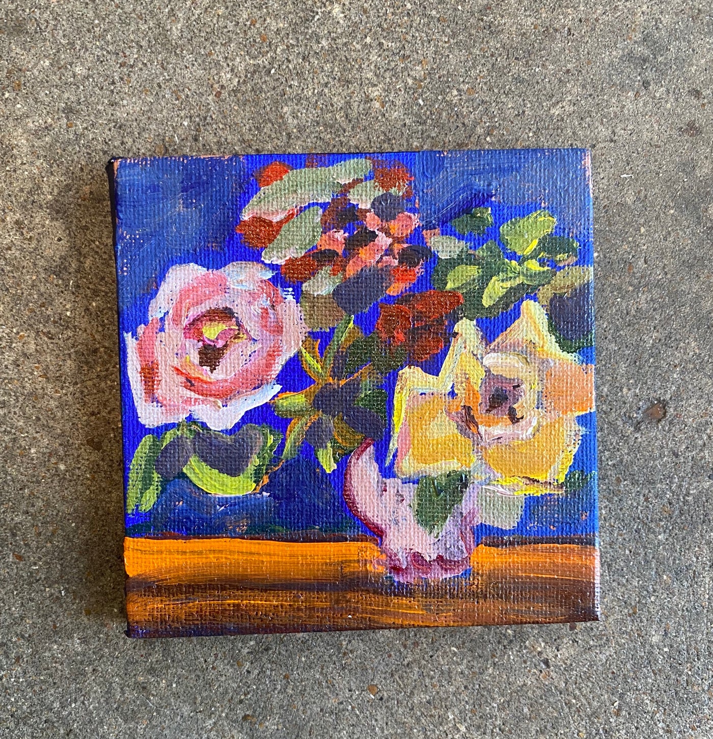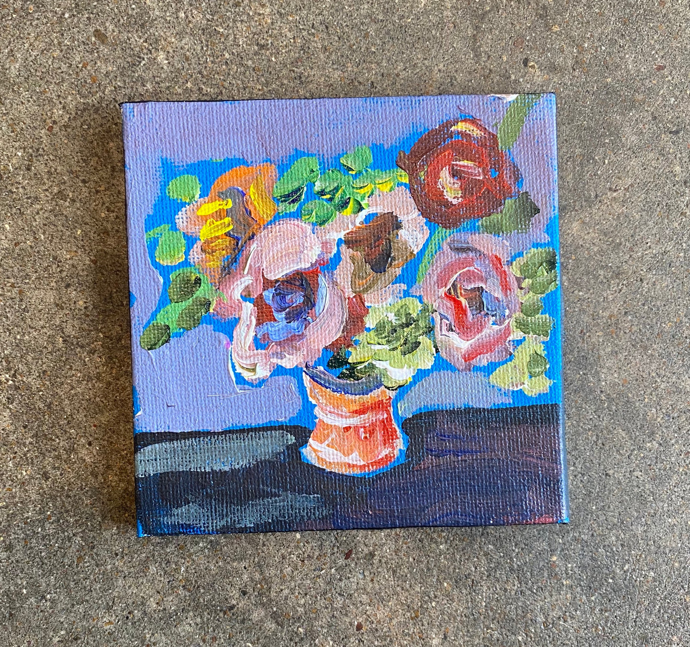 Hand painted floral artwork on a small square canvas by Amy VanHoy. Easel included.