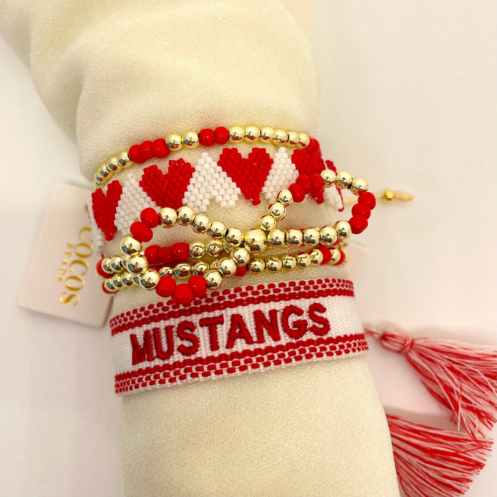 Add a touch of charm to your look with The Clara Bow - Red bracelet. Featuring a shiny gold bow accented by Memorial Mustang Red beads, this playful and trendy piece makes a perfect statement for your Friday night football outfit. Its cute design brings a fun, stylish flair that’s sure to catch eyes and spark compliments.
